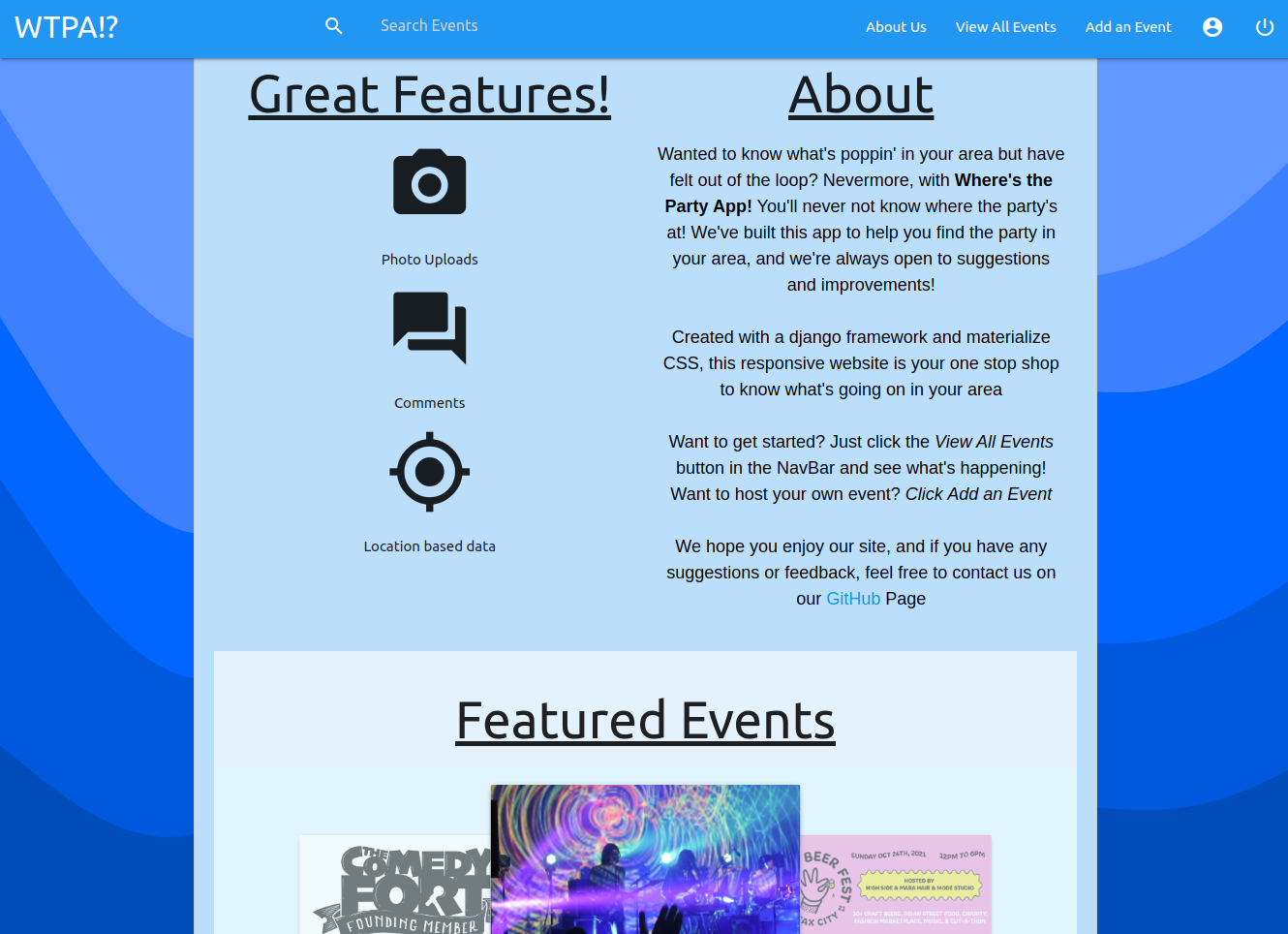 WTPA is a Web Application where you can view all the events that are happening in your city and around the world! View the Location using the Google Maps API